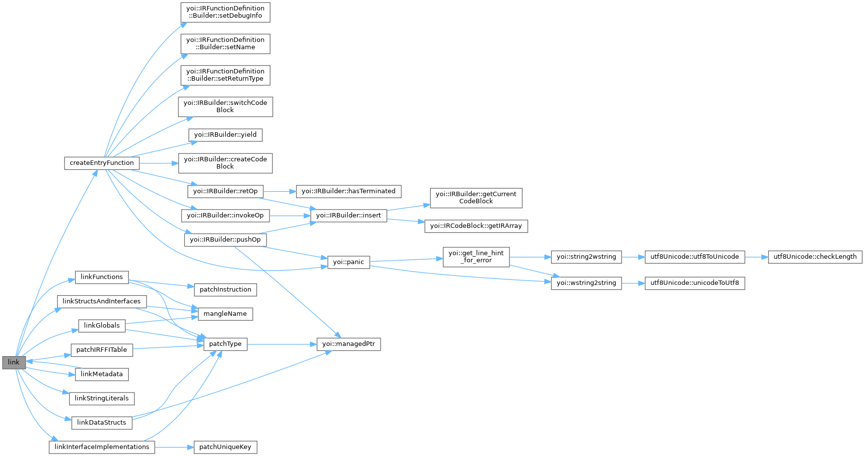 References IRLinker::compilerCtx, IRLinker::createEntryFunction(), ENTRY_MODULE_ID_CONST, IRLinker::entryModuleId, IRLinker::finalModule, IRLinker::linkDataStructs(), IRLinker::linkFunctions(), IRLinker::linkGlobals(), IRLinker::linkInterfaceImplementations(), IRLinker::linkMetadata(), IRLinker::linkStringLiterals(), IRLinker::linkStructsAndInterfaces(), and IRLinker::patchIRFFITable().