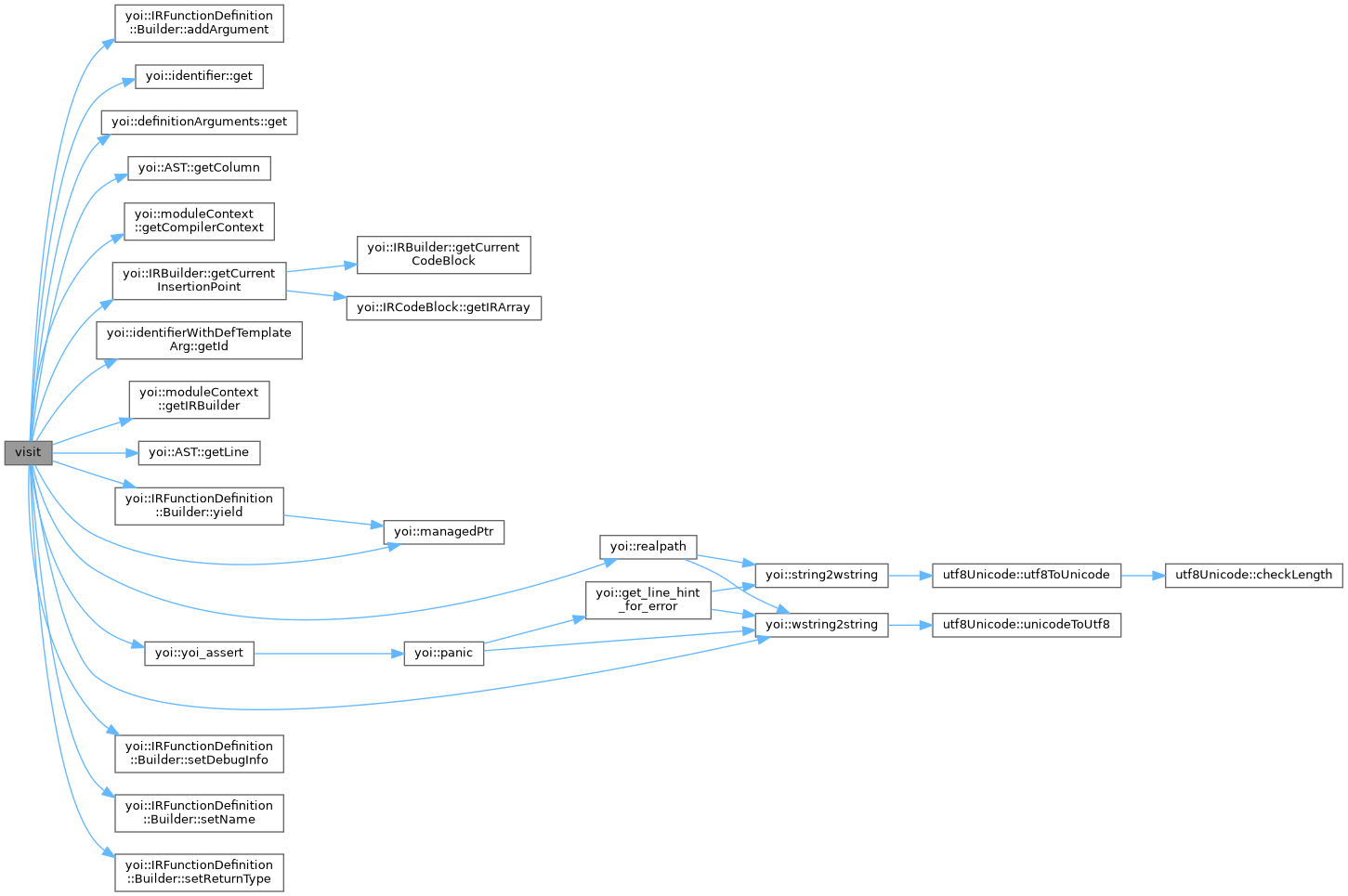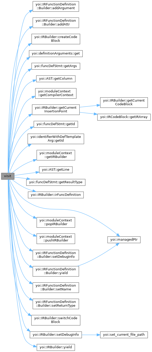 References IRFunctionDefinition::Builder::addArgument(), innerMethodDecl::args, innerMethodDecl::attrs, IRFunctionDefinition::Builder::attrs, importDecl::from_path, identifier::get(), definitionArguments::get(), AST::getColumn(), moduleContext::getCompilerContext(), IRBuilder::getCurrentInsertionPoint(), identifierWithDefTemplateArg::getId(), moduleContext::getIRBuilder(), AST::getLine(), importDecl::inner, yoi::managedPtr(), innerMethodDecl::name, yoi::realpath(), innerMethodDecl::resultType, IRFunctionDefinition::Builder::setDebugInfo(), IRFunctionDefinition::Builder::setName(), IRFunctionDefinition::Builder::setReturnType(), lexer::token::strVal, yoi::wstring2string(), IRFunctionDefinition::Builder::yield(), and yoi::yoi_assert().