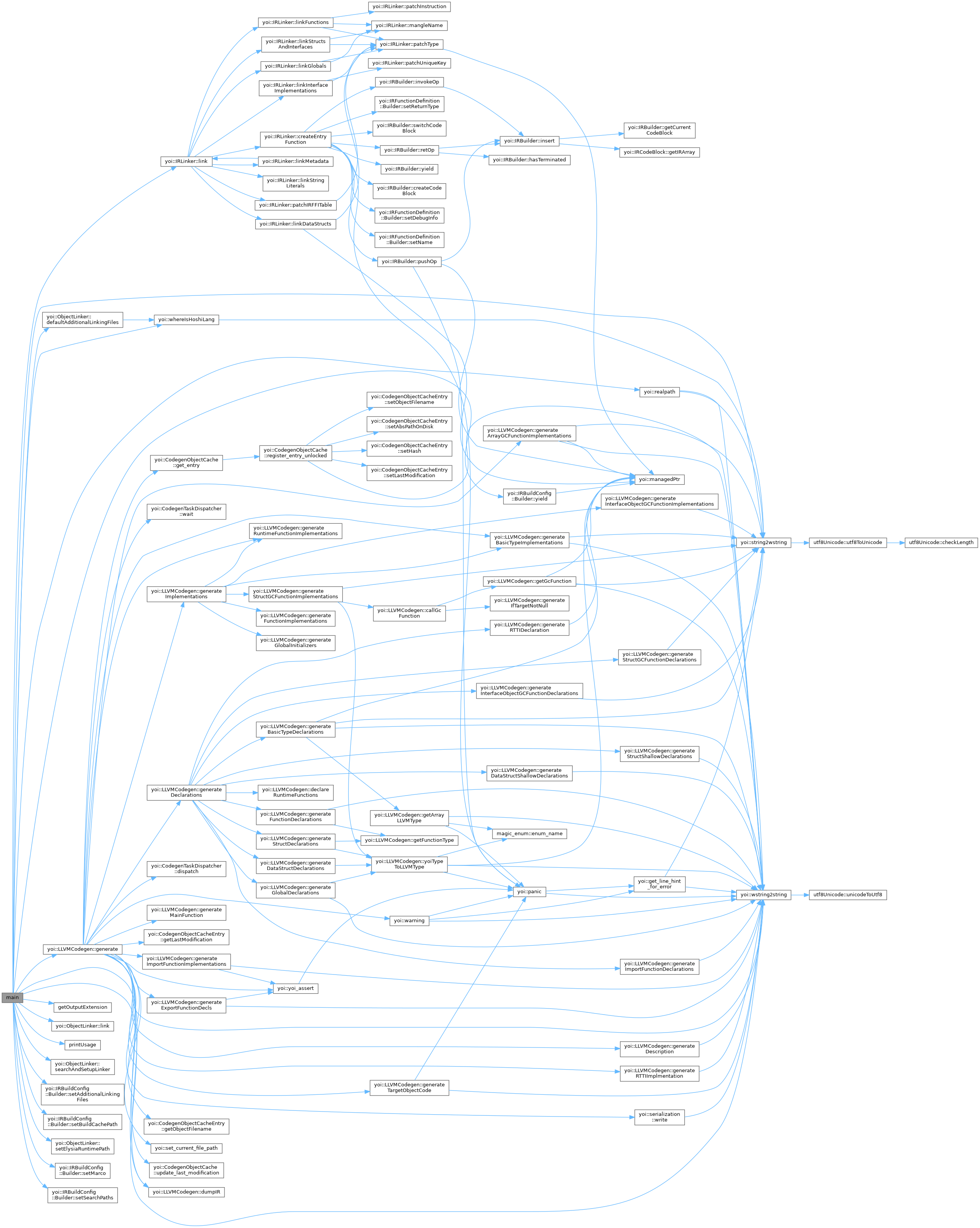 References IRBuildConfig::cc, IRBuildConfig::cl, IRBuildConfig::debug, ObjectLinker::defaultAdditionalLinkingFiles(), LLVMCodegen::dumpIR(), yoi::exception_categories, IRBuildConfig::executable, LLVMCodegen::generate(), getOutputExtension(), HOSHI_LANG_GIT_COMMIT_HASH, HOSHI_LANG_VERSION, IRBuildConfig::library, IRLinker::link(), ObjectLinker::link(), IRBuildConfig::none, yoi::Panic, printUsage(), yoi::realpath(), IRBuildConfig::release, ObjectLinker::searchAndSetupLinker(), IRBuildConfig::Builder::setAdditionalLinkingFiles(), IRBuildConfig::Builder::setBuildCachePath(), ObjectLinker::setElysiaRuntimePath(), IRBuildConfig::Builder::setMarco(), IRBuildConfig::Builder::setSearchPaths(), yoi::string2wstring(), yoi::Suppress, TIMER, yoi::Warning, yoi::whereIsHoshiLang(), yoi::wstring2string(), IRBuildConfig::Builder::yield(), YOI_ARCH, and YOI_PLATFORM.